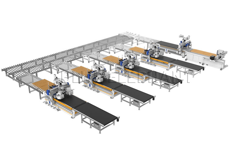 一托四模壓門板生產(chǎn)線組成:貼標(biāo)機(jī)、自動(dòng)上下料齒條開料機(jī) 、動(dòng)力輥筒線、翻板機(jī)、自動(dòng)上下料絲杠機(jī)